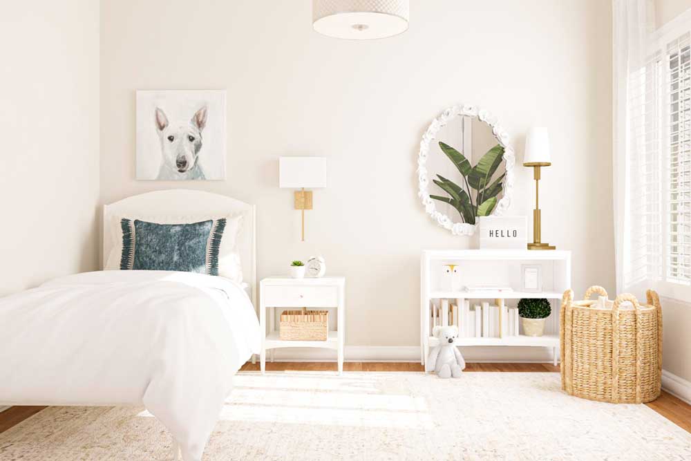 رنگ سفید باعث افزایش روشنایی و باز بودن فضا می‌شود و برای اتاق‌های کوچک عالی است. این رنگ حس نظم، آرامش و تمرکز را تقویت می‌کند. ترکیب سفید با آبی یا خاکستری، یک محیط متعادل و آرامش‌بخش ایجاد می‌کند.
